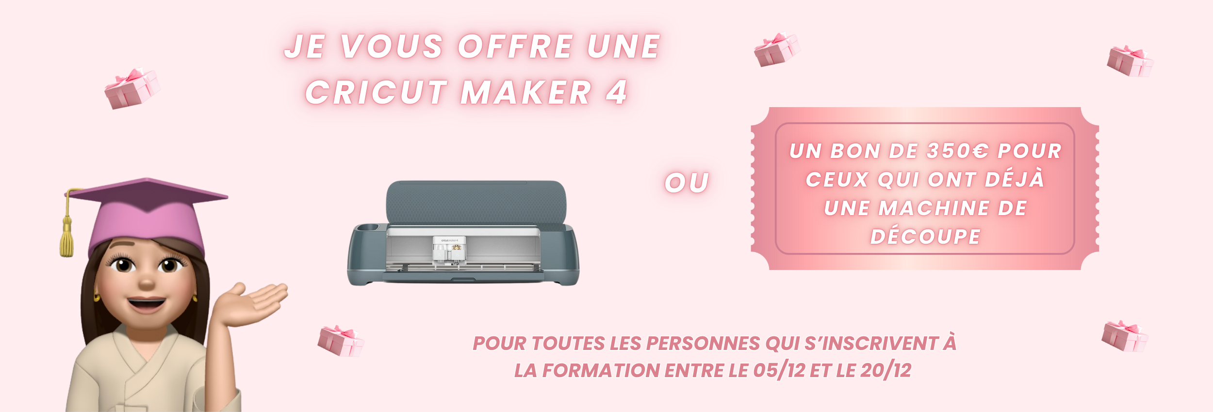 Pour toute inscription à la formation entre le 05/12 et le 20/12 tente de gagner une cricut maker 4 ou un bon de 350€ !